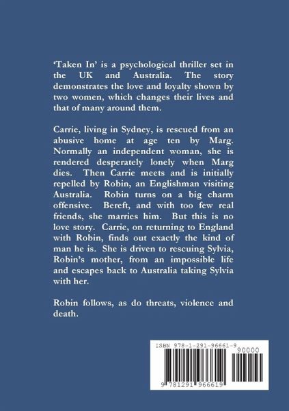 'Taken In' is a psychological thriller set in the UK and Australia. The story demonstrates the love and loyalty shown by two women, which changes their lives and that of many around them. Carrie, living in Sydney, is rescued from an abusive home at age ten by Marg. Normally an independent woman, she is rendered desperately lonely when Marg dies. Then Carrie meets and is initially repelled by Robin, an Englishman visiting Australia. Robin turns on a big charm offensive. Bereft, and with too few real friends, she marries him. But this is no love story. Carrie, on returning to England with Robin, finds out exactly the kind of man he is. She is driven to rescuing Sylvia, Robin's mother, from an impossible life and escapes back to Australia taking Sylvia with her. Robin follows, as do threats, violence and death.