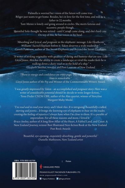 Pulmulla is worried her vision of the future will come true. Biligiri just wants to get home. Besides, he's in love for the first time, and will be a father in 22 months. Tant-Meisie is lonely and going around in circles. She meets famous and eccentric people though. Hannibal Solo thought he was retired - until Carroll came along, and she's hard case. On top of this, he has voices in his head. "Absorbing and lyrical, and poignant in the elephants' message. Like Heathcote Williams' Sacred Elephant before it, Taken deserves a wide readership." -Gareth Patterson, author of The Secret Elephants and Beyond the Secret Elephants. "A writer of striking originality with qualities of daring and humour that are rare. Like Lloyd Jones, Alex has the ability to create a landscape so vivid the reader feels he is walking down a dusty road or in the hold of a ship." -Elizabeth Smither, novelist and Poet Laureate of New Zealand "There is energy and confidence on every page. The way you inhabit your lines is remarkable." -Lloyd Jones author of Mr Pip and Winner of the Commonwealth Writers' Award. "I was greatly impressed by Taken - an accomplished and poignant story. Here was a writer of considerable potential should he decide to write longer fiction..." - Tessa Duder CNZM OBE, author of the Alex quartet, winner of Storyline Margaret Mahy Medal. "I've read and re-read your story, and I think this: It is intriguing, beautifully-crafted, moving and poetic... It brings the knowing eye of elephants to bear on the reader, creating the feeling of injustice I always have when I'm close to them. It's a parable of imperialism. For all these reasons and more, I loved it." -Bruce Ansley, author of A long Slow Affair of the Heart, A Fabled Land, and Coast: A New Zealand Journey, winner Best Illustrated Non-fiction Book at the New Zealand Post Book Awards "Beautiful, eye opening, exquisitely absorbing, gentle and powerful." -Danielle Mathieson, New Zealand artist