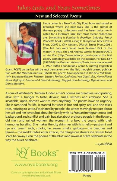 Linda Lerner's latest book, TAKES GUTS AND YEARS SOMETIMES, is a collection of poems dating from the early 80's to the present. An immigrant daughter's courageous search for her identity, her refusal to compromise who she is for a paycheck or for love is viewed in the backdrop of major public events. Upheavals in her personal life are paralleled by those in the larger world. There's the bombing of the World Trade Center in 1993 and the subsequent attack in 2001 six blocks from her home. This latter event triggers memories of stories her estranged father told about his escape from Russia. There are the hardships caused by gentrification. The locale is primarily New York City, but it could be any place, where the fault lines of vulnerability in individual lives suddenly give way to tremors outside, and the earth shifts beneath them.