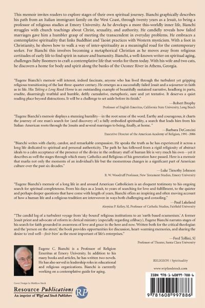 This memoir invites readers to explore stages of their own spiritual journey. Bianchi graphically describes his path from an Italian immigrant family on the West Coast, through twenty years as a Jesuit, to being a professor of religious studies at Emory University. As he develops a more this-worldly inner life, Bianchi struggles with church teachings about Christ, sexuality, and authority. He candidly reveals how failed marriages gave him a humbler grasp of meeting the transcendent in everyday problems. He embraces a contemplative spirituality that links Buddhist and Taoist practices with western mysticism. With a foot in Christianity, he shows how to walk a way of inter-spirituality as a meaningful road for the contemporary seeker. For Bianchi this involves becoming a metaphorical Christian as he moves away from religious certitudes of early life to find spirit in nature and humanity. Bianchi, a well-known writer on spiritual aging, challenges Baby Boomers to craft a contemplative life that works for them today. With his wife and two cats, he discovers a home for body and spirit along the banks of the Oconee River in Athens, Georgia.