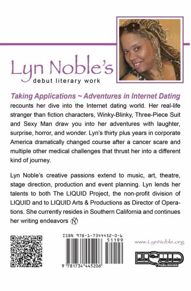 Lyn Noble's debut literary work, Taking Applications ~ Adventures in Internet Dating, recounts Lyn's dive into the Internet dating world. Her real-life stranger than fiction characters, "Winky-Blinky", "Sexy Man", and "Three-Piece Suit and a Facerag aka Washcloth," draw you into her adventures with laughter, surprise, horror, and wonder. The names have been changed but the stories are absolutely and hilariously true. You'll say to yourself, "No way he did that!" or "Wait, What just happened here?!?!" "This fast-paced page turner is one of the best reads of the year! Funny and relevant." ~KClark "The Music and Me" had me wiping the tears away" -JJ Caballero.