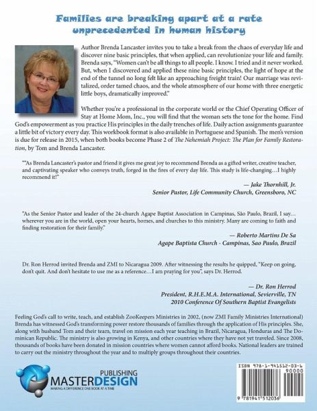 Author Brenda Lancaster invites you to take a break from the chaos of everyday life and discover nine basic principles, that when applied, can revolutionize your life and family. Brenda says, "Women can't be all things to all people. I know. I tried and it never worked. But, when I discovered and applied these nine basic principles, the light of hope at the end of the tunnel no long felt like an approaching freight train! Our marriage was revitalized, order tamed chaos, and the whole atmosphere of our home with three energetic little boys, dramatically improved." Whether you're a professional in the corporate world or the Chief Operating Officer of Stay at Home Mom, Inc., you will find that the woman sets the tone for the home. Find God's empowerment as you practice His principles in the daily trenches of life. Daily action assignments guarantee a little bit of victory every day. This workbook format is also available in Portuguese and Spanish.