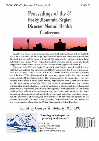 Recent years have seen an extraordinary number of major disasters, critical incidents and other events that have had major impacts on our world. The 2004 tsunami, hurricanes Rita and Katrina, and the wars in Iraq and Afghanistan affect millions of lives daily. Potential events such as Avian Flu pandemic, global warming and the increasing threats of spreading unrest in the Middle East are concerns that weigh heavily on us all. November 8-11, 2006, the Rocky Mountain Region Disaster Mental Health Institute held their Annual four-day Disaster Mental Health Conference. The theme of the conference was "TAKING CHARGE IN TROUBLED TIMES: Response, Resilience, Recovery and Follow-up." This edition contains the major papers presented at the conference and summaries of additional presentations. They address some of the major crisis events confronting our societies in recent years, namely, large disasters such as hurricanes Katrina and Rita; case studies such as Abu Ghraib, and traumatic events such as a night club suicide bombing, the role of cultural sensitivity and ethics in disaster settings, resilience, and the importance of planning, education and taking care of our first responders and mental health professionals. An additional concern with information includes information about preparation of communities and families for deployment and return of military personnel. The importance of planning for how mental health personnel can respond in the event of an Avian Flu Pandemic is also discussed. Presenters are drawn from researchers and responders from Wyoming, the United States, and the United Kingdom. http://www.rmrinstitute.org The Rocky Mountain Region Disaster Mental Health Institute is a 501(c)3 Non-profit Organization