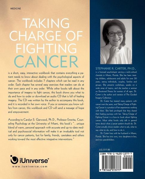 TAKING CHARGE OF FIGHTING CANCER is a short, easy, interactive workbook that contains everything a patient needs to know about dealing with the psychological aspects of cancer. The workbook includes 7 chapters which can be read in any order. Each chapter has several easy exercises that readers can do at their own pace and in any order. While other books talk about the importance of imagery to fight cancer, this book shows you what to do and how to order or download an audio CD that is full of healing imagery. The CD was written by the author to accompany this book, and it is recorded in her own voice. If you or someone you know suffers from cancer, this workbook and CD will send a message of hope and empowerment. According to Carolyn S. Garwood, Ph.D., Professor Emerita, Counseling Psychology at the University of Miami, this book's "...unique blend of warm, personal approach with accurate and up-to-date medical and psychosocial information will make it an invaluable tool not only for cancer patients, but for family, friends, caretakers and others working toward the most effective integrative interventions."