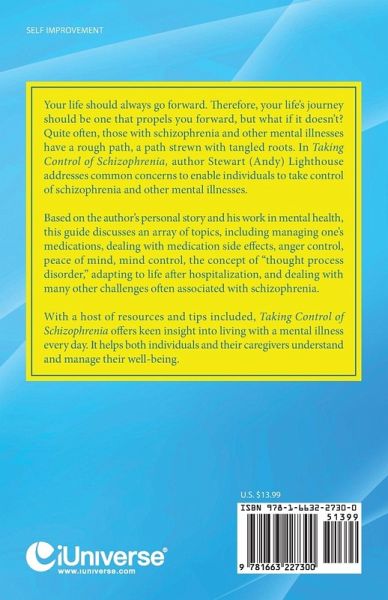 Your life should always go forward. Therefore, your life's journey should be one that propels you forward, but what if it doesn't? Quite often, those with schizophrenia and other mental illnesses have a rough path, a path strewn with tangled roots. In Taking Control of Schizophrenia, author Stewart (Andy) Lighthouse addresses common concerns to enable individuals to take control of schizophrenia and other mental illnesses. Based on the author's personal story and his work in mental health, this guide discusses an array of topics, including managing one's medications, dealing with medication side effects, anger control, peace of mind, mind control, the concept of "thought process disorder," adapting to life after hospitalization, and dealing with many other challenges often associated with schizophrenia. With a host of resources and tips included, Taking Control of Schizophrenia offers keen insight into living with a mental illness every day. It helps both individuals and their caregivers understand and manage their well-being.