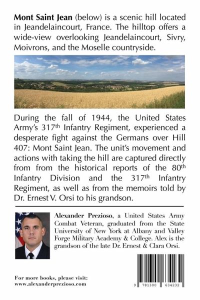 Mont Saint Jean is a scenic hill located in Jeandelaincourt, France. The hilltop offers a wide-view overlooking Jeandelaincourt, Sivry, Moivrons, and the Moselle countryside. During the fall of 1944, the United States Army's 317th Infantry Regiment, experienced a desperate fight against the Germans over Hill 407: Mont Saint Jean. The unit's movement and actions with taking the hill are captured directly from from the historical reports of the 80th Infantry Division and the 317th Infantry Regiment, as well as from the memoirs told by Dr. Ernest V. Orsi to his grandson.