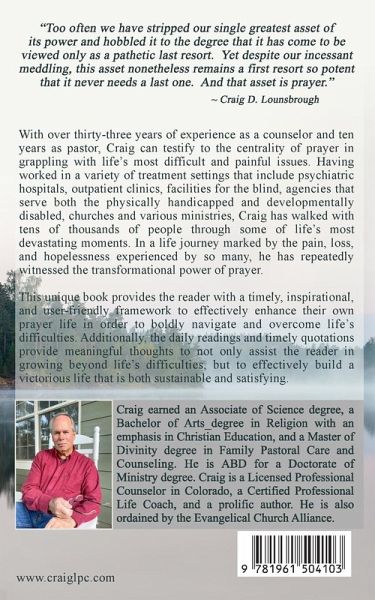 "Too often we have stripped our single greatest asset of its power and hobbled it to the degree that it has come to be viewed only as a pathetic last resort. Yet despite our incessant meddling, this asset nonetheless remains a first resort so potent that it never needs a last one. And that asset is prayer." - Craig D. Lounsbrough With over thirty-three years of experience as a counselor and ten years as pastor, Craig can testify to the centrality of prayer in grappling with life's most difficult and painful issues. Having worked in a variety of treatment settings that include psychiatric hospitals, outpatient clinics, facilities for the blind, agencies that serve both the physically handicapped and developmentally disabled, churches and various ministries. Craig has walked with tens of thousands of people through some of life's most devastating moments. In a life journey marked by the pain, loss and hopelessness experienced by so many, he has repeatedly witnessed the transformational power of prayer. This unique book provides the reader with a timely, inspirational, and user-friendly framework to effectively enhance their own prayer life in order to boldly navigate and overcome life's difficulties. Additionally, the daily readings and timely quotations provide meaningful thoughts to not only assist the reader in growing beyond life's difficulties, but to effectively build a victorious life that is both sustainable and satisfying.