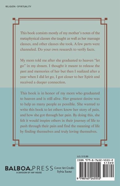 This book consists mostly of my mother's notes of the metaphysical classes she taught as well as her massage classes, and other classes she took. A few parts were channeled. Do your own research to verify facts. My mom told me after she graduated to heaven "let go" in my dream. I thought it meant to release the past and memories of her but then I realized after a year when I did let go, I got closer to her Spirit and received a deeper connection. This book is in honor of my mom who graduated to heaven and is still alive. Her greatest desire was to help as many people as possible. She wanted to write this book to let others know her story of pain, and how she got through her pain. By doing this, she felt it would inspire others in their journey of life to push through their pain and find the meaning of life by finding themselves and truly loving themselves.