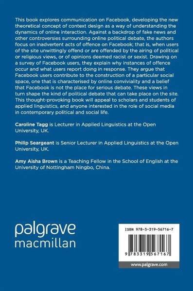 This book explores communication on Facebook, developing the new theoretical concept of context design as a way of understanding the dynamics of online interaction. Against a backdrop of fake news and other controversies surrounding online political debate, the authors focus on inadvertent acts of offence on Facebook; that is, when users of the site unwittingly offend or are offended by the airing of political or religious views, or of opinions deemed racist or sexist. Drawing on a survey of Facebook users, they explain why instances of offence occur and what users report doing in response. They argue that Facebook users contribute to the construction of a particular social space, one that is characterised by online conviviality and a belief that Facebook is not the place for serious debate. These views in turn shape the kind of political debate that can take place on the site. This thought-provoking book will appeal to scholars and students of applied linguistics, and anyone interested in the role of social media in contemporary political and social life.