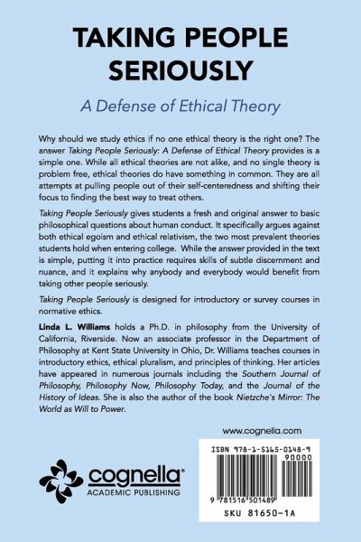 Why should we study ethics if no one ethical theory is the right one? The answerTaking People Seriously: A Defense of Ethical Theory provides is a simple one. While all ethical theories are not alike, and no single theory is problem free, ethical theories do have something in common. They are all attempts at pulling people out of their self-centeredness and shifting their focus to finding the best way to treat others. Taking People Seriously gives students a fresh and original answer to basic philosophical questions about human conduct. It specifically argues against both ethical egoism and ethical relativism, the two most prevalent theories students hold when entering college. While the answer provided in the text is simple, putting it into practice requires skills of subtle discernment and nuance, and it explains why anybody and everybody would benefit from taking other people seriously. Taking People Seriously is designed for introductory or survey courses in normative ethics. Linda L. Williams holds a Ph.D. in philosophy from the University of California, Riverside. Now an associate professor in the Department of Philosophy at Kent State University in Ohio, Dr. Williams teaches courses in introductory ethics, ethical pluralism, and principles of thinking. Her articles have appeared in numerous journals including the Southern Journal of Philosophy, Philosophy Now, Philosophy Today, and the Journal of the History of Ideas. She is also the author of the book Nietzche's Mirror: The World as Will to Power.