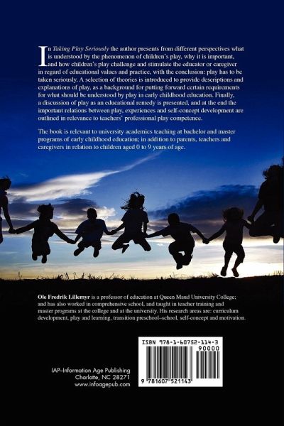 In the book the author presents from different perspectives what is understood by the phenomenon of children's play, why it is important, and how children's play challenge and stimulate the educator or caregiver in regard of educational values and practice, with the conclusion: play has to be taken seriously. A selection of theories is introduced to provide descriptions and explanations of play, as a background for putting forward certain requirements for what should be understood by play in early childhood education. Finally, a discussion of play as an educational remedy is presented, and at the end the important relations between play, experiences and self-concept development are outlined in relevance to teachers' professional play competence. The book is relevant to university academics teaching at bachelor and master programs of early childhood education; in addition to parents, teachers and caregivers in relation to children aged 0 to 9 years of age.