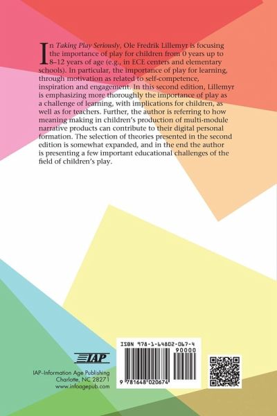 In the book, the author is focusing the importance of play for children from 0 years up to 8-12 years of age, e.g. in ECE centers and elementary schools. In particular, the importance of play for learning, through motivation as related to self-competence, inspiration and engagement. In this second edition, the author is emphasizing more thoroughly the importance of play as a challenge of learning, with implications for children, as well as for teachers. Further, the author is referring to how meaning making in children's production of multi-module narrative products can contribute to their digital personal formation. The selection of theories presented in the second edition is somewhat expanded, and in the end the author is presenting a few important educational challenges of the field of children's play.