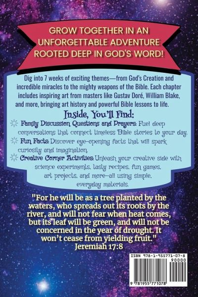 Ready for a family adventure rooted in faith? Taking Root is a unique 7-week devotional that will spark curiosity, foster meaningful connections, and deepen your family's faith. Each day brings something new, with themes and activities designed for all ages. Explore 7 Fascinating Themes:Creation Wonders - Discover the marvels of God's creation. Amazing Biblical Creatures - Encounter legendary beings like the unicorn, behemoth, leviathan, and more. Weapons of the Bible - Explore the different types of weapons used in the Bible. Miracles of Jesus - Be amazed as we walk through jaw-dropping stories of hope and wonder. Extraordinary Blessings for Ordinary People - See how God can use anyone to do amazing things in His name. The Undeniable Bible & Apologetics - Find truth and strength in God's Word. The Armor of God - Bring the Armor of God to life in a way that's engaging for all. Discover and Grow Every day uncovers something new to explore! Daily Fun Facts reveal amazing details from the Bible that spark curiosity and imagination. Family Discussion Questions and Prayers create opportunities for deep conversations, connecting biblical wisdom to everyday life. Get Hands-On in the Creative Corner Bring faith into action with activities that are as fun as they are meaningful. From science experiments and tasty recipes to family games and art projects, each activity uses simple, everyday materials to make faith a vibrant, shared experience. Taking Root is more than just a devotional - it's a journey that strengthens faith, builds connection, and brings joy to every family moment. Gather your family, open the book, and watch your faith grow deeper with every page. As Jeremiah 17:8 says, "For he will be as a tree planted by the waters, who spreads out its roots by the river, and will not fear when heat comes, but its leaf will be green, and will not be concerned in the year of drought. It won't cease from yielding fruit." Grow strong roots that will help your family flourish for a lifetime. Grab your copy now and let the adventure begin!