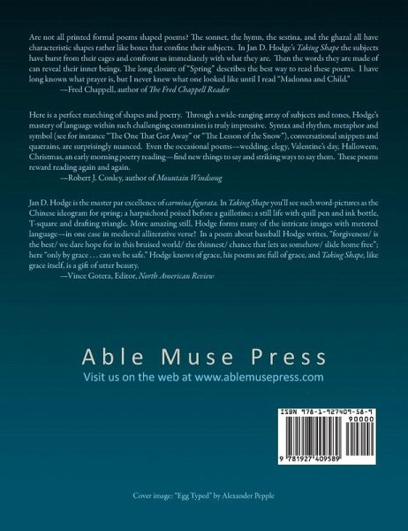 An eclectic mix of shapes and subjects populate Taking Shape—Jan D. Hodge’s full-length collection of carmina figurata (sometimes called shaped poems, pattern poetry, or figure poems). Hodge’s many masterpieces include depictions of a saxophone, a Madonna and Child, a combination piano/guillotine, and other silhouettes of amazing difficulty and detail. These poems are not only visually stunning, they are also sonically beautiful, and retain a transcendent freedom while conforming to both illustrative and metrical constraints. Taking Shape is a visual feast of inspired poetry. PRAISE FOR TAKING SHAPE: Are not all printed formal poems shaped poems? The sonnet, the hymn, the sestina, and the ghazal all have characteristic shapes rather like boxes that confine their subjects. In Jan D. Hodge’s Taking Shape the subjects have burst from their cages and confront us immediately with what they are. Then the words they are made of can reveal their inner beings. The long closure of "Spring" describes the best way to read these poems. I have long known what prayer is, but I never knew what one looked like until I read "Madonna and Child." — Fred Chappell, author of The Fred Chappell Reader Here is a perfect matching of shapes and poetry. Through a wide-ranging array of subjects and tones, Hodge’s mastery of language within such challenging constraints is truly impressive. Syntax and rhythm, metaphor and symbol (see for instance "The One That Got Away" or "The Lesson of the Snow"), conversational snippets and quatrains, are surprisingly nuanced. Even the occasional poems—wedding, elegy, Valentine’s day, Halloween, Christmas, an early morning poetry reading—find new things to say and striking ways to say them. These poems reward reading again and again. — Robert J. Conley, author of Mountain Windsong Jan D. Hodge is the master par excellence of carmina figurata. In Taking Shape you’ll see such word-pictures as the Chinese ideogram for spring; a harpsichord poised before a guillotine; a still life with quill pen and ink bottle, T-square and drafting triangle. More amazing still, Hodge forms many of the intricate images with metered language—in one case in medieval alliterative verse! In a poem about baseball Hodge writes, "forgiveness/ is the best/ we dare hope for in this bruised world/ the thinnest/ chance that lets us somehow/ slide home free"; here "only by grace . . . can we be safe." Hodge knows of grace, his poems are full of grace, and Taking Shape, like grace itself, is a gift of utter beauty. — Vince Gotera, Editor, North American Review ABOUT THE AUTHOR: Having grown up in a letterpress print shop in small town Michigan, Jan D. Hodge received his BA and MA degrees from the University of Michigan and his PhD from the University of New Mexico, where he wrote his dissertation on Charles Dickens. He taught at Rockford (Illinois) College and at Morningside College in Sioux City, Iowa. His poems have appeared in Iambs & Trochees, American Arts Quarterly, Defined Providence, and many other print and online journals.