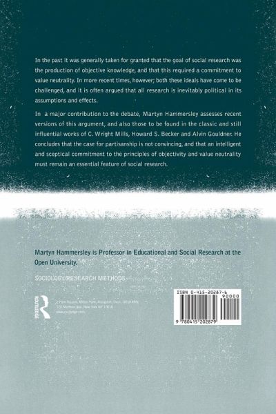 In the past it was generally taken for granted that the goal of social research was the production of objective knowledge; and that this required a commitment to value neutrality. In more recent times, however, both these ideals have come to be challenged, and it is often argued that all research is inevitably political in its assumptions and effects. In this major contribution to the debate, Martyn Hammersley assesses the arguments from the classic and still influential contributions of C. Wright Mills, Howard Becker and Alvin Gouldner to the present day. He concludes that the case for partisanship is not convincing, and that an intelligent and sceptical commitment to the principles of objectivity and value neutrality must remain an essential feature of research.