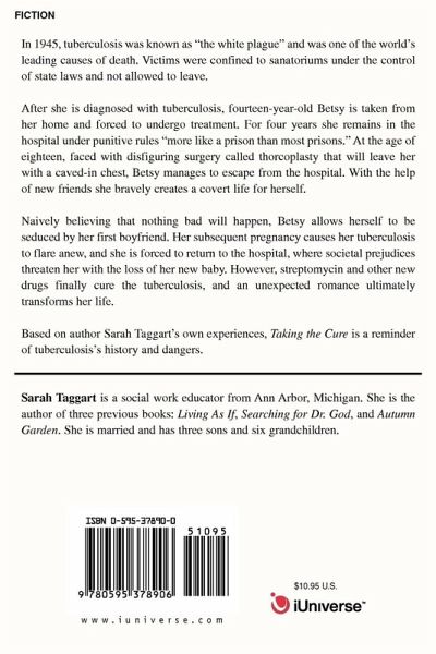 In 1945, tuberculosis was known as 'the white plague" and was one of the world's leading causes of death. Victims were confined to sanatoriums under the control of state laws, and they were not allowed to leave. After she is diagnosed with tuberculosis, fourteen-year-old Betsy is taken from her home and forced to undergo treatment. For four years she remains in the hospital under punitive rules 'more like a prison than most prisons." At the age of eighteen, faced with disfiguring surgery called thorcoplasty that will leave her with a caved-in chest, Betsy manages to escape from the hospital. With the help of new friends she bravely creates a covert life for herself. Naively believing that nothing bad will happen, Betsy allows herself to be seduced by her first boyfriend. Her subsequent pregnancy causes her tuberculosis to flare anew, and she is forced to return to the hospital, where societal prejudices threaten her with the loss of her new baby. However, streptomycin and other new drugs finally cure the tuberculosis, and an unexpected romance ultimately transforms her life. Based on author Sarah Taggart's own experiences, Taking the Cure is a reminder of tuberculosis's history and dangers.