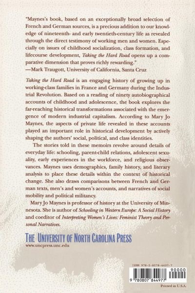 Taking the Hard Road is an engaging history of growing up in working-class families in France and Germany during the Industrial Revolution. Based on a reading of ninety autobiographical accounts of childhood and adolescence, the book explores the far-reaching historical transformations associated with the emergence of modern industrial capitalism. According to Mary Jo Maynes, the aspects of private life revealed in these accounts played an important role in historical development by actively shaping the authors' social, political, and class identities. The stories told in these memoirs revolve around details of everyday life: schooling, parent-child relations, adolescent sexuality, early experiences in the workforce, and religious observances. Maynes uses demographics, family history, and literary analysis to place these details within the context of historical change. She also draws comparisons between French and German texts, men's and women's accounts, and narratives of social mobility and political militancy.
