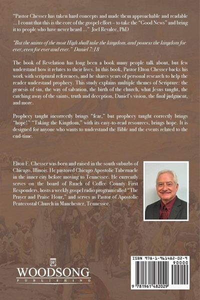 The book of Revelation has long been a book many people talk about, but few understand how it relates to their lives. In this book, Pastor Elton Chesser backs his work with scriptural references, and he shares years of personal research to help the reader understand prophecy. This study explains multiple themes of Scripture: the genesis of sin, the way of salvation, the birth of the church, what Jesus taught, the catching away of the saints, truth and deception, Daniel's vision, the final judgment, and more.   Prophecy taught incorrectly brings "fear," but prophecy taught correctly brings "hope!" "Taking the Kingdom," with its easy-to-read resources, brings hope. It is designed for anyone who wants to understand the Bible and the events related to the end-time.