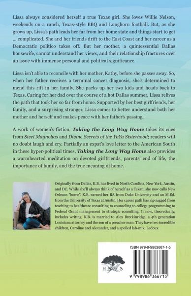 Lissa always considered herself a true Texas girl. She loves Willie Nelson, weekends on a ranch, Texas-style BBQ and Longhorn football. But, as she grows up, Lissa's path leads her far from her home state and things start to get ... complicated. She and her friends drift to the East Coast and her career as a Democratic politico takes off. But her mother, a quintessential Dallas housewife, cannot understand her views, and their relationship fractures over an issue with immense personal and political significance. Lissa isn't able to reconcile with her mother, Kathy, before she passes away. So, when her father receives a terminal cancer diagnosis, she's determined to mend this rift in her family. She packs up her two kids and heads back to Texas. Caring for her dad over the course of a hot Dallas summer, Lissa relives the path that took her so far from home. Supported by her best girlfriends, her family, and a surprising stranger, Lissa comes to better understand both her mother and herself and makes peace with her father's passing. A work of women's fiction, Taking the Long Way Home takes its cues from Steel Magnolias and Divine Secrets of the YaYa Sisterhood; readers will no doubt laugh and cry. Partially an expat's love letter to the American South in these hyper-political times, Taking the Long Way Home also provides a warmhearted meditation on devoted girlfriends, parents' end of life, the importance of family, and the true meaning of home.