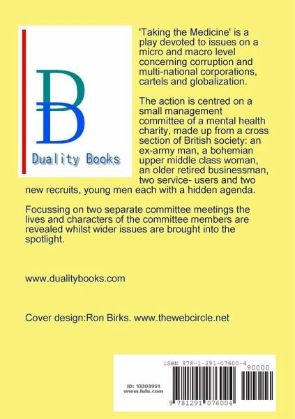 'Taking the Medicine' is a play devoted to issues on a micro and macro level concerning corruption and multi-national corporations,controlling cartels and globalization. The action is centred on a small management committee of a mental health charity, made up from a cross section of British society: an ex-army man, a bohemian upper middle class woman, an older retired businessman, two service users and two new recruits, young men each with a hidden agenda. Focussing on three separate committee meetings, the lives and characters of the committee members are revealed whilst wider issues are brought into the spotlight.....