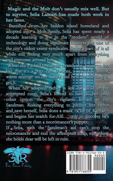 Magic and the Mob don't usually mix well. But to survive, Selia Lascari has made both work in her favor. Banished from her hidden island homeland and adopted into a Mob family, Selia has spent nearly a decade learning to live in the "modern" world of technology and doing legitimate business for one of the city's oldest crime syndicates. Being a part of it all while still feeling very much apart from everything and everyone around her. When she's asked to run an errand, she discovers too late that it's a trap. Alfi Barboni, a would-be suitor, wants revenge on her family and he'll do anything to get it. When her adopted father is left for dead in the attempted coup, Selia's forced to turn to her only other option: the city's vigilante known as the Sandman. Risking everything to protect her father and save herself, Selia dons a mask -a lot of Kevlar - and begins her search for Alfi... only to discover he's nothing more than a necromancer's puppet. If Selia, with the Sandman's aid can't stop the necromancer and end the attempted coup, everything she holds dear will be left in ruin.