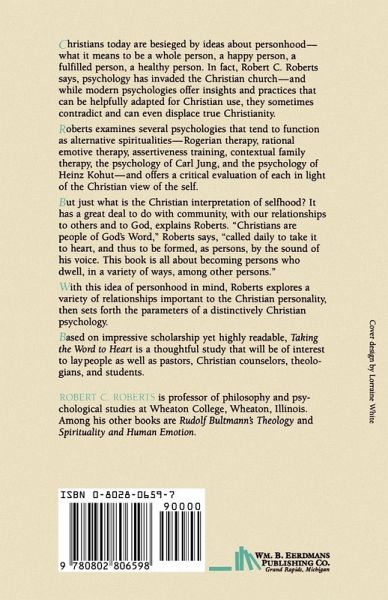 This is a print on demand book and is therefore non- returnable. Christians today are besieged by ideas about personhood — what it means to be a whole person, a happy person, a fulfilled person, a healthy person. In fact, Robert C. Roberts says, psychology has invaded the Christian church — and while modern psychologies offer insights and practices that can be helpfully adapted for Christian use, they sometimes contradict and can even displace true Christianity. Roberts examines several psychologies that tend to function as alternative spiritualities — Rogerian therapy, rational emotive therapy, assertiveness training, contextual family therapy, the psychology of Carl Jung, and the psychology of Hienz Kohut — and offers a critical evaluation of each in light of the Christian view of the self. But just what is the Christian interpretation of selfhood? It has a great deal to do with community, with our relationships to others and to God, explains Roberts. "Christians are people of God's Word," Roberts says, "called daily to take it to heart, and thus be formed, as persons, by the sound of his voice. This book is all about becoming persons who dwell, in a variety of ways, among other persons." With this idea of personhood in mind, Roberts explores a variety of relationships important to the Christian personality, then sets forth the parameters of a distinctively Christian psychology. Based on impressive scholarship yet highly readable, Taking the Word to Heart is a thoughtful study that will be of interest to laypeople as well as pastors, Christian counselors, theologians, and students.
