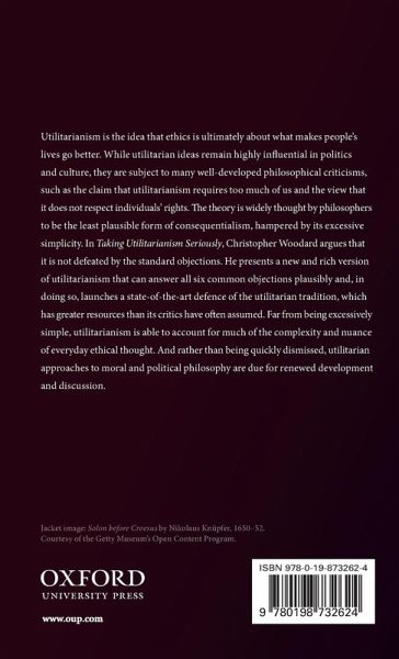 Utilitarianism is the idea that ethics is ultimately about what makes people's lives go better. While utilitarian ideas remain highly influential in politics and culture, they are subject to many well-developed philosophical criticisms, such as the claim that utilitarianism requires too much of us and the view that it does not respect individuals' rights. The theory is widely thought by philosophers to be the least plausible form of consequentialism, hampered by its excessive simplicity. In Taking Utilitarianism Seriously, Christopher Woodard argues that it is not defeated by the standard objections. He presents a new and rich version of utilitarianism that can answer all six commons objections plausibly and, in doing so, launches a state-of-the-art defence of the utilitarian tradition, which has greater resources than its critics have often assumed. Far from being excessively simple, utilitarianism is able to account for much of the complexity and nuance of everyday ethical thought. And rather than being quickly dismissed, utilitarian approaches to moral and political philosophy are due for renewed development and discussion.