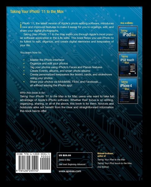 Taking Your iPhoto '11 to the Max walks users through Apple's most popular software application in the iLife suite-iPhoto. This book helps readers use iPhoto to its fullest to organize and create digital memories and keepsakes. Learn all about Apple's newest version of iPhoto-iPhoto '11 Explore iPhoto, one menu button at a time Walk-through tutorials guide you step-by-step