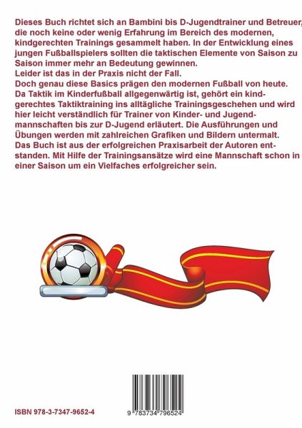 Dieses Buch richtet sich an Bambini bis D-Jugendtrainer und Betreuer, die noch keine oder wenig Erfahrung im Bereich des modernen, kindgerechten Trainings gesammelt haben. In der Entwicklung eines jungen Fußballspielers sollten die taktischen Elemente von Saison zu Saison immer mehr an Bedeutung gewinnen. Leider ist das in der Praxis nicht der Fall. Doch genau diese Basics prägen den modernen Fußball von heute.Da Taktik im Kinderfußball allgegenwärtig ist, gehört ein kindgerechtes Taktiktraining ins alltägliche Trainingsgeschehen und wird hier leicht verständlich für Trainer von Kinder- und Jugendmannschaften bis zur D-Jugend erläutert. Die Ausführungen und Übungen werden mit zahlreichen Grafiken und Bildern untermalt. Das Buch ist aus der erfolgreichen Praxisarbeit der Autoren entstanden. Mit Hilfe der Trainingsansätze wird eine Mannschaft schon in einer Saison um ein Vielfaches erfolgreicher sein.