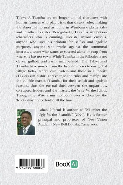 Takwe A Taamba are no longer animal characters with human features who play tricks distort rules', make the abnormal normal as found in Wimbum trickster tales and in other folktales. Derogatorily Takwe is any person (character) who is cunning, trickish, anyone envious, anyone who uses his wisdom for selfish and egoistic purposes. anyone who works against the communal interest, anyone who wants to succeed alone or reap from where he has not sown. While Taamba in the folktales is not clever, gullible and easily manipulated. The Takwe and Taamba have moved from the fireside stories to our global village today, where our leaders and those in authority (Takwe) can distort and change the rules and manipulate the gullible masses (Taamba) for their selfish and egoistic reasons thus the eternal duel between the unpatriotic, corrupted leaders and the masses, the Wise Vs the Idiots.Though the 'Wise' claim monopoly over wisdom but the 'Idiots' may not be fooled all the time.