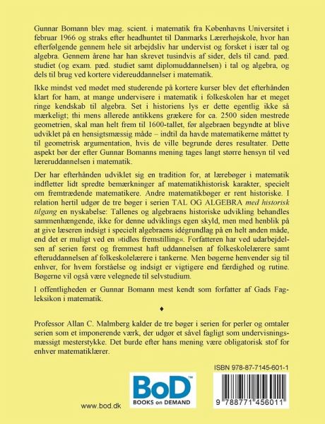 Der har efterhånden udviklet sig en tradition for, at lærebøger i matematik indfletter lidt spredte bemærkninger af matematikhistorisk karakter, specielt om fremtrædende matematikere. Andre matematikbøger er rent historiske. I relation hertil udgør de tre bøger i serien TAL OG ALGEBRA med historisk tilgang en nyskabelse: Tallenes og algebraens historiske udvikling behandles sammenhængende, ikke for denne udviklings egen skyld, men med henblik på at give læseren indsigt i specielt algebraens idégrundlag på en helt anden måde, end det er muligt ved en "tidløs fremstilling".