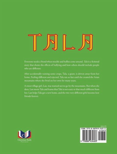 Everyone needs a friend when trouble and bullies come around. Tala is a fictional story that shows the effects of bullying and how others should include people who are different. After accidentally ruining some crops, Tala, a giant, is driven away from her home. Feeling different and rejected, Tala ran so fast until she created the Asian mountains where she lived on her own for many years. A sweet village girl, Lan, was warned not to go by the mountains. But when she does, Lan meets Tala and learns that Tala is not scary or that much different from her. Lan helps Tala get a new home, and the two very different girls become best friends forever.