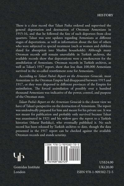 This is the smoking gun linking Talaat Pasha, the Ottoman Minister of Interior and later Grand Vizier, to the Armenian Genocide of 1915. The report was prepared for Talaat Pasha and meant for his private use. In all likelihood, it would have been destroyed, were it not for the fact that Talaat was assassinated in Berlin 1921, and his widow kept and then gave the report to a Turkish historian who eventually published it. According to Talaat's figures over 1,150,000 Armenians disappeared in the Ottoman Empire between 1915-1917. This number includes well over 100,000 Armenians who fled from the Ottoman Empire during WWI, but it does not include tens of thousands of Armenian women and children who were forcefully Islamized and absorbed into Muslim families. Talaat Pasha's Report on the Armenian Genocide also includes additional materials from his private papers showing the systematic confiscation of over 40,000 Armenian properties, surely an undercount, as "abandoned" properties confiscated by the Ottoman State cir. 1917. These records add substance to the testimonies of survivors of the Armenian Genocide and onlooker, including foreign missionaries and consular representative in the interior of Ottoman Turkey, most notably United States officials in Trebizond, Harpoot (Elazig), Mersin, Aleppo and Damascus.Much of the statistical information in Talaat's papers have been turned into colour maps for the perusal of readers.