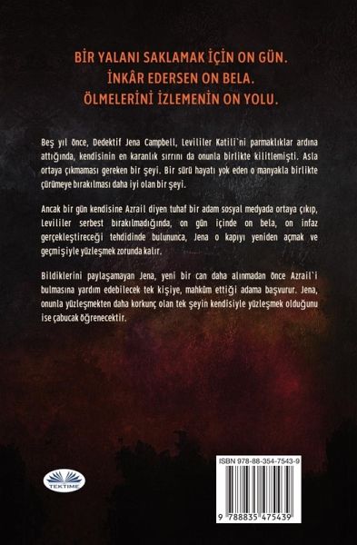 Gerçekle yüzle¿mek, katille yüzle¿mekten daha ölümcül olabilir. Bir yalan¿ saklamak için on gün. ¿nkâr edersen on bela. Ölmelerini izlemenin on yolu. Be¿ y¿l önce, Dedektif Jena Campbell, Levililer Katili`ni parmakl¿klar ard¿na att¿¿¿nda, kendisinin en karanl¿k s¿rr¿n¿ da onunla birlikte kilitlemi¿ti. Asla ortaya ç¿kmamas¿ gereken bir ¿eyi. Bir sürü hayat¿ yok eden o manyakla birlikte çürümeye b¿rak¿lmas¿ daha iyi olan bir ¿eyi. Ancak bir gün kendisine Azrail diyen tuhaf bir adam sosyal medyada ortaya ç¿k¿p, Levililer serbest b¿rak¿lmad¿¿¿nda, on gün içinde on bela, on infaz gerçekle¿tirece¿i tehdidinde bulununca, Jena o kap¿y¿ yeniden açmak ve geçmi¿iyle yüzle¿mek zorunda kal¿r. Bildiklerini payläamayan Jena, yeni bir can daha al¿nmadan önce Azrail`i bulmas¿na yard¿m edebilecek tek ki¿iye, mahkûm etti¿i adama bävurur. Jena, onunla yüzle¿mekten daha korkunç olan tek ¿eyin kendisiyle yüzle¿mek oldüunu ise çabucak ö¿renecektir.