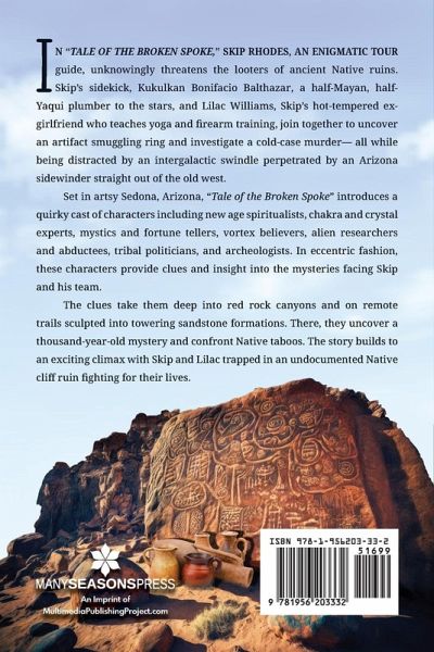 In "Tale Of The Broken Spoke,¿ Skip Rhodes, an enigmatic tour guide, unknowingly threatens the looters of ancient Native ruins. Skip's sidekick, Kukulkan Bonifacio Balthazar, a half-Mayan, half-Yaqui plumber to the stars, and Lilac Williams, Skip's hot-tempered ex-girlfriend who teaches yoga and firearm training, join together to uncover an artifact smuggling ring and investigate a cold-case murder- all while being distracted by an intergalactic swindle perpetrated by an Arizona sidewinder straight out of the old west. Set in artsy Sedona, Arizona, "Tale of the Broken Spoke¿ introduces a quirky cast of characters including new age spiritualists, chakra and crystal experts, mystics and fortune tellers, vortex believers, alien researchers and abductees, tribal politicians, and archeologists. In eccentric fashion, these characters provide clues and insight into the mysteries facing Skip and his team. The clues take them deep into red rock canyons and on remote trails sculpted into towering sandstone formations. There, they uncover a thousand-year-old mystery and confront Native taboos. The story builds to an exciting climax with Skip and Lilac trapped in an undocumented Native cliff ruin fighting for their lives.