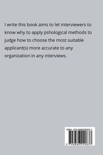 I write this book aims to let interviewers to know why to apply pshological methods to judge how to choose the most suitable applicant(s) more accurate to any organization in any interviews. This book consists three chapters. The first chapter indicates what the common interviews are as well as explains why interviewers need to apply psychological methods to test any applicant behaviors in any interview process. The second chapter explains how to apply psychological recruitment strategies effect/manage in the recruitment process to achieve more effective and efficient interview as well as explains how to apply occupational psychological test method to test applicant's ability. The third chapter how selection assessment methods are applied to choose the best applicants to achieve the most effective and efficient interview result as well as how to criteria for selecting and evaluating assessment methods in interview which are the most reasonable support.