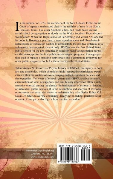In the summer of 1970, the members of the New Orleans Fifth Circuit Court of Appeals understood clearly the realities of race in the South. Houston, Texas, like other Southern cities, had made haste toward racial school desegregation as slowly as the White Southern Federal courts would allow. When the High School of Performing and Visual Arts opened its doors in Houston a year later, a new superintendent and liberal-dominated Board of Education wished to demonstrate the positive potential of a voluntarily desegregated student body. HSPVA was the first United States public school for the arts specifically used for racial desegregation purposes, the prototype for the first public urban magnet program of desegregation used to replace a standing court order, and a continuing prototype for other public magnet schools for the arts across the United States. Talent Knows No Color is a 35-year history of HSPVA, exemplary in both arts and academics, which chronicles multi-perspective participant experiences within the context of ever-changing district education policies and demographics. Ten years of school system and HSPVA archival research, examination of local newspapers, and oral history interviews allow a rich narrative unusual among the already limited number of scholarly histories of individual public schools. It is the description and analysis of everyday occurrences that assist the reader in understanding what Series Editor O. L. Davis, Jr. refers to as "the continuing, likely never ending, practical development of one particular high school and its curriculum."