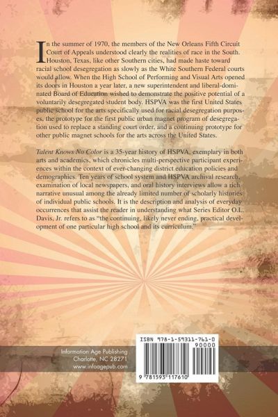 In the summer of 1970, the members of the New Orleans Fifth Circuit Court of Appeals understood clearly the realities of race in the South. Houston, Texas, like other Southern cities, had made haste toward racial school desegregation as slowly as the White Southern Federal courts would allow. When the High School of Performing and Visual Arts opened its doors in Houston a year later, a new superintendent and liberal-dominated Board of Education wished to demonstrate the positive potential of a voluntarily desegregated student body. HSPVA was the first United States public school for the arts specifically used for racial desegregation purposes, the prototype for the first public urban magnet program of desegregation used to replace a standing court order, and a continuing prototype for other public magnet schools for the arts across the United States. Talent Knows No Color is a 35-year history of HSPVA, exemplary in both arts and academics, which chronicles multi-perspective participant experiences within the context of ever-changing district education policies and demographics. Ten years of school system and HSPVA archival research, examination of local newspapers, and oral history interviews allow a rich narrative unusual among the already limited number of scholarly histories of individual public schools. It is the description and analysis of everyday occurrences that assist the reader in understanding what Series Editor O. L. Davis, Jr. refers to as "the continuing, likely never ending, practical development of one particular high school and its curriculum."