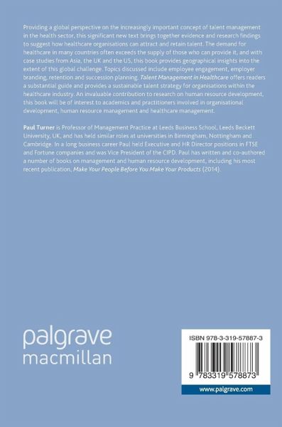 Providing a global perspective on the increasingly important concept of talent management in the health sector, this significant new text brings together evidence and research findings to suggest how healthcare organisations can attract and retain talent. The demand for healthcare in many countries often exceeds the supply of those who can provide it, and with case studies from Asia, the UK and the US, this book provides geographical insights into the extent of this global challenge. Topics discussed include employee engagement, employer branding, retention and succession planning. Talent Management in Healthcare offers readers a substantial guide and provides a sustainable talent strategy for organisations within the healthcare industry. An invaluable contribution to research on human resource development, this book will be of interest to academics and practitioners involved in organisational development, human resource management and healthcare management.