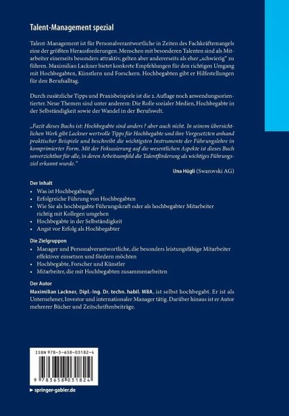 "Talent-Management" ist für Personalverantwortliche in Zeiten des Fachkräftemangels eine der größten Herausforderungen. Menschen mit besonderen Talenten und Hochbegabte sind als Mitarbeiter einerseits besonders attraktiv, gelten aber andererseits als eher "schwierig" zu führen. Erfolgsautor Maximilian Lackner bietet konkrete Empfehlungen für den effektiven Umgang mit Hochbegabten, Künstlern und Forschern im Unternehmen. Hochbegabten gibt er Hilfestellungen für den eigenen Berufsalltag.