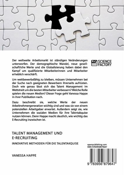 Der weltweite Arbeitsmarkt ist ständigen Veränderungen unterworfen. Der demographische Wandel, neue gesellschaftliche Werte und die Globalisierung haben dabei den Kampf um qualifizierte Mitarbeiterinnen und Mitarbeiter erheblich verschärft.Um wettbewerbsfähig zu bleiben, müssen Unternehmen bei der Suche nach geeigneten Bewerbern ihrerseits aufrüsten. Doch wie genau lässt sich das Talent Management im Wettstreit um die besten Mitarbeiter verbessern? Welche Rolle spielen die neuen Medien? Dieser Frage geht Vanessa Happe in ihrer Publikation nach.Dazu beschreibt sie, welche Werte der neuen Arbeitnehmergeneration wichtig sind und was sie von einem potenziellen Arbeitgeber erwartet. Außerdem zeigt sie, wie Unternehmen die sozialen Medien für ihre Talentakquise nutzen können. Denn Happe macht deutlich, wie wichtig das E-Recruiting inzwischen ist.Aus dem Inhalt:-Digitalisierung;-Generation Y;-Generation Z;-War of Talents;-Recruiting;-Mitarbeiterbindung