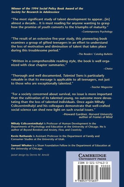 Acknowledgments 1. Introduction Part I. Talented Teens: 2. What is talent? 3. How the study was conducted: methods and procedures 4. What are talented teenagers like? 5. How talented teenagers live Part II. The development of Talent: 6. Fields and domains of talent in adolescence 7. The experience of talent 8. How families influence the development of talent 9. Schools, teachers, and talent development Part III. The Cultivation of Talent: 10. Commitment to talent and its correlates 11. Cultivating talent throughout life 12. What have we learned? Appendixes References Index.