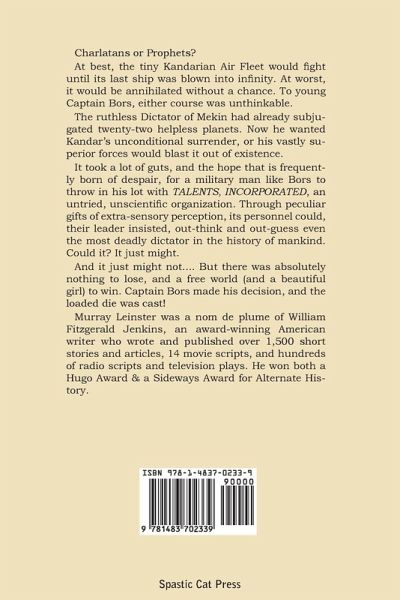 Charlatans or Prophets? At best, the tiny Kandarian Air Fleet would fight until its last ship was blown into infinity. At worst, it would be annihilated without a chance. To young Captain Bors, either course was unthinkable. The ruthless Dictator of Mekin had already subjugated twenty-two helpless planets. Now he wanted Kandar's unconditional surrender, or his vastly superior forces would blast it out of existence. It took a lot of guts, and the hope that is frequently born of despair, for a military man like Bors to throw in his lot with TALENTS, INCORPORATED, an untried, unscientific organization. Through peculiar gifts of extra-sensory perception, its personnel could, their leader insisted, out-think and out-guess even the most deadly dictator in the history of mankind. Could it? It just might. And it just might not.... But there was absolutely nothing to lose, and a free world (and a beautiful girl) to win. Captain Bors made his decision, and the loaded die was cast! Murray Leinster was a nom de plume of William Fitzgerald Jenkins, an award-winning American writer who wrote and published over 1,500 short stories and articles, 14 movie scripts, and hundreds of radio scripts and television plays. He won both a Hugo Award & a Sideways Award for Alternate History.