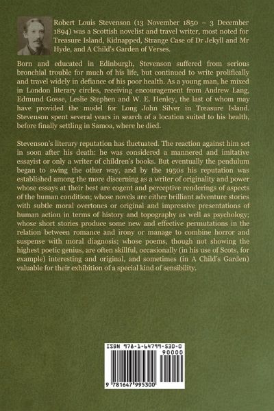 Robert Louis Stevenson (13 November 1850 – 3 December 1894) was a Scottish novelist and travel writer, most noted for Treasure Island, Kidnapped, Strange Case of Dr Jekyll and Mr Hyde, and A Child's Garden of Verses. Born and educated in Edinburgh, Stevenson suffered from serious bronchial trouble for much of his life, but continued to write prolifically and travel widely in defiance of his poor health. As a young man, he mixed in London literary circles, receiving encouragement from Andrew Lang, Edmund Gosse, Leslie Stephen and W. E. Henley, the last of whom may have provided the model for…mehr