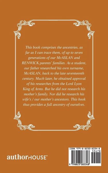 This book comprises the ancestries, as far as I can trace them, of up to seven generations of our McASLAN and RENWICK parents' families. As a student, our father researched his own surname, McASLAN, back to the late seventeenth century. Much later, he obtained approval of his researches from the Lord Lyon King of Arms. But he did not research his mother's family. Nor did he research his wife's / our mother's ancestors. This book thus provides a full ancestry of ourselves.