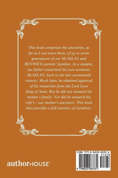 This book comprises the ancestries, as far as I can trace them, of up to seven generations of our McASLAN and RENWICK parents' families. As a student, our father researched his own surname, McASLAN, back to the late seventeenth century. Much later, he obtained approval of his researches from the Lord Lyon King of Arms. But he did not research his mother's family. Nor did he research his wife's / our mother's ancestors. This book thus provides a full ancestry of ourselves.