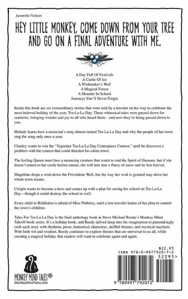 Hey Little Monkey, come down from your tree and go on a final adventure with me. A Day Full Of Festivals A Castle Of Ice A Wishmaker's Well A Magical Forest A Monster In School Journeys You'll Never Forget Inside this book are six extraordinary stories that were told by a traveler on his way to celebrate the most beloved holiday of the year, Tra-La-La Day. These whimsical tales were passed down for centuries, bringing wonder and joy to all who heard them-and now they're being passed down to you. Melody learns how a musician's song almost ruined Tra-La-La Day and why the people of her town sing the song only once a year. Charley wants to win the "Vogsetter Tra-La-La Day Centerpiece Contest," until he discovers a problem with the contest that could threaten his entire town. The Iceling Queen must face a menacing creature that wants to end the Spirit of Humans, but if she doesn't return to her castle before sunset, she will turn into a flurry of snow and be lost forever. Mageltine drops a wish down the Frivoldene Well, but the way her wish is granted may drive her whole town insane. Crispin wants to become a hero and comes up with a plan for saving his school on Tra-La-La Day-though it could destroy the school as well. Every child in Bridledon is afraid of Miss Pinberry, until a lost traveler learns of her plan to control the town's children. Tales For Tra-La-La Day is the final anthology book in Steve Michael Reedy's Monkey Mind Tales® book series. It's a holiday book, and Reedy delved deep into his imagination to painstakingly craft each story with rhythmic prose, fantastical characters, skillful rhymes, and mystical mayhem. With both wit and wisdom, Reedy continues to explore themes that are universal to us all, while creating a magical holiday that readers will want to celebrate again and again.