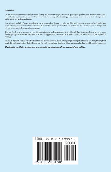 Dear father, Let me introduce you to a world of adventure, fantasy and learning through a storybook specially designed for your children. In this book, you will find a selection of stories that will take your little ones to magical and exciting places, where they can explore their own imaginations and discover new abilities and values. From the verdant hills of an enchanted forest to the vast reaches of space, our tales are filled with unique characters and will teach them valuable lessons about life and the world around them. In these stories, your children will embark on epic adventures, face challenges, and solve mysteries that only imagination can create. This storybook is an investment in your children's education and development, as it will teach them important lessons about courage, friendship, empathy, resilience, and creativity. It is also an opportunity to strengthen the bond between parents and children through shared reading. So, father, if you are looking for a storybook that will entertain your children, while giving them important lessons and strengthening their bond, this book is the perfect choice. I guarantee that both you and your children will have a wonderful and memorable reading experience. Thank you for considering this storybook as an option for the education and entertainment of your children.