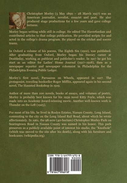 Christopher Morley (5 May 1890 - 28 March 1957) was an American journalist, novelist, essayist and poet. He also produced stage productions for a few years and gave college lectures. Morley began writing while still in college. He edited The Haverfordian and contributed articles to that college publication. He provided scripts for and acted in the college's drama program. He played on the cricket and soccer teams. In Oxford a volume of his poems, The Eighth Sin (1912), was published. After graduating from Oxford, Morley began his literary career at Doubleday, working as publicist and publisher's reader. In 1917 he got his start as an editor for Ladies' Home Journal (1917-1918), then as a newspaper reporter and newspaper columnist in Philadelphia for the Philadelphia Evening Public Ledger. Morley's first novel, Parnassus on Wheels, appeared in 1917. The protagonist, traveling bookseller Roger Mifflin, appeared again in his second novel, The Haunted Bookshop in 1919. He was one of the founders and a longtime contributing editor of the Saturday Review of Literature. A highly gregarious man, he was the mainstay of what he dubbed the "Three Hours for Lunch Club". Out of enthusiasm for the Sherlock Holmes stories, he helped found The Baker Street Irregulars and wrote the introduction to the standard omnibus edition of The Complete Sherlock Holmes. He also wrote an introduction to the standard omnibus edition of The Complete Works of Shakespeare in 1936, although Morley called it an "Introduction to Yourself as a Reader of Shakespeare". That year, he was appointed to revise and enlarge Bartlett's Familiar Quotations (11th edition in 1937 and 12th edition in 1948). He was one of the first judges for the Book of the Month Club, serving in that position until the early 1950s. Author of more than 100 novels, books of essays, and volumes of poetry, Morley is probably best known for his 1939 novel Kitty Foyle, which was made into an Academy Award-winning movie. Another well-known work is Thunder on the Left (1925). For most of his life, he lived in Roslyn Estates, Nassau County, Long Island, commuting to the city on the Long Island Rail Road, about which he wrote affectionately. In 1961, the 98-acre (40-hectare) Christopher Morley Park on Searingtown Road in Nassau County was named in his honor. This park preserves as a publicly available point of interest his studio, the "Knothole" (which was moved to the site after his death), along with his furniture and bookcases. (wikipedia.org)