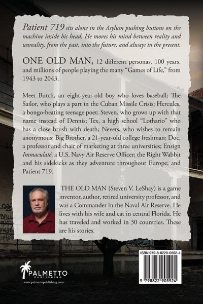 Patient 719 sits alone in the Asylum pushing buttons on the machine inside his head. He moves his mind between reality and unreality, from the past, into the future, and always in the present. ONE OLD MAN, 12 different personas, 100 years, and millions of people playing the many "Games of Life," from 1943 to 2043. Meet Butch, an eight-year-old boy who loves baseball; The Sailor, who plays a part in the Cuban Missile Crisis; Hercules, a bongo-beating teenage poet; Steven, who grows up with that name instead of Dennis; Tex, a high school "Lothario" who has a close brush with death; Nevets, who wishes to remain anonymous; Big Brother, a 21-year-old college freshman; Doc, a professor and chair of marketing at three universities; Ensign Immaculaté, a U.S. Navy Air Reserve Officer; the Right Wabbit and his sidekicks as they adventure throughout Europe; and Patient 719.Recipient of 2024 President's Book Awards Silver Medal Winner (Florida Authors and Publishers Association)